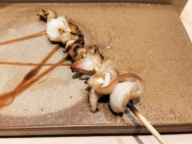 そして!貝ひものネタを出してもらった際、板前さんから「残った部位の串焼きです」と、サービスで一品追加してくれました。