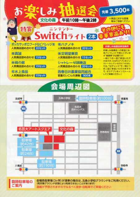 | アクセス | 名鉄犬山線「西春駅」より徒歩約15分 臨時駐車場約100台(五条小学校グラウンド) 会場周辺の駐車場は約424台 |