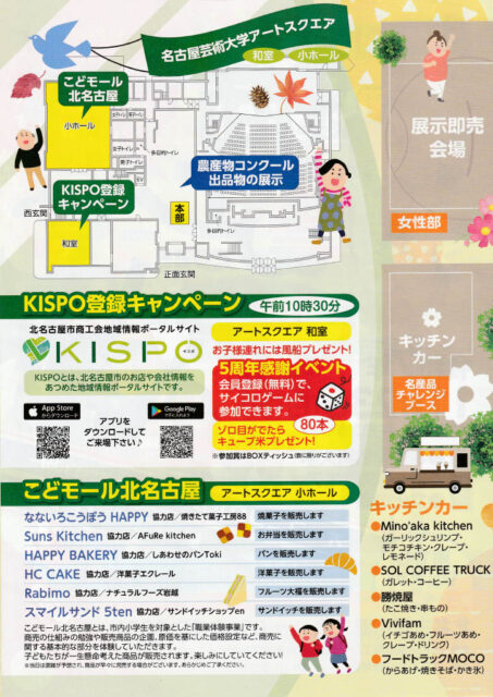 その他にも、KISPO登録キャンペーン(北名古屋市の地域情報ポータルサイトへの登録でお子様連れにお菓子プレゼント)や、名産品開発委員会のチャレンジブース(ダーツ体験・名産品試作販売)、女性部バザー(みたらし団子・ぜんざい等)なども予定されています。