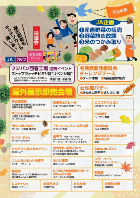 また、文化の森周辺では屋外展示即売会場もあり、お餅や和菓子、洋菓子、飲み物、生活雑貨など様々なお店が出店します。